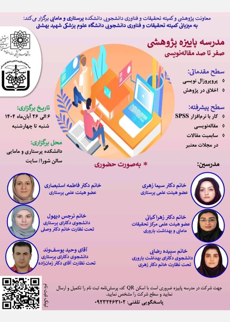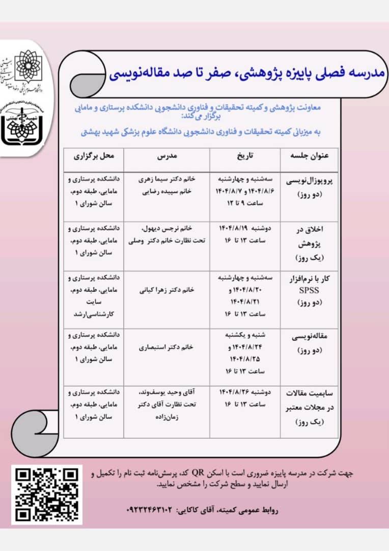 اتمام دوره ۸ روزه مدرسه فصلی پژوهشی پاییزه دانشکده پرستاری و مامایی در دو سطح مقدماتی و پیشرفته، که به همت معاونت پژوهشی و کمیته تحقیقات و فناوری دانشجویی برای دومین سال متوالی در دانشکده اجرا گردیده بود