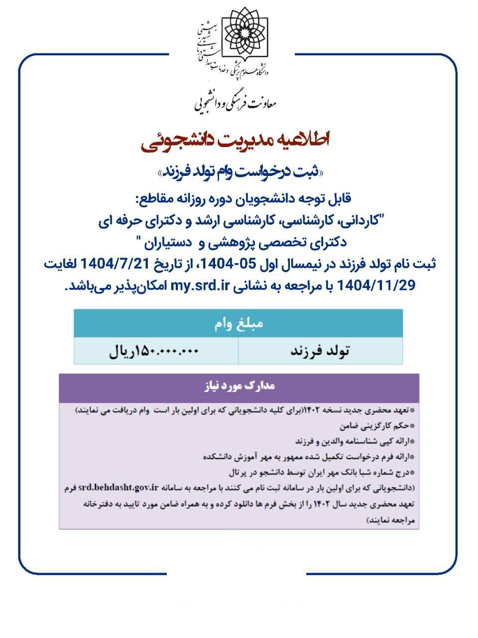 ️وام تولد فرزند به دانشجویانی تعلق می‌گیرد که در زمان تحصیل صاحب فرزند شده‌اند.