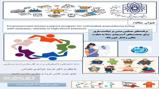 ژورنال کلاب ویژه دانشجویان کارشناسی ارشد پرستاری تمامی گرایشها با موضوع : توانمندسازی جمعیت آسیب پذیر مبتلا به دیابت چاقی و فشار خون بالا با نظارت دکتر فرشته جواهری طهرانی عضو هیئت علمی گروه پرستاری سلامت جامعه سه شنبه 18 آذر ساعت 12:30 تا 13:30 در دانشکده پرستاری و مامایی در کلاس A2 برگزار می گردد.