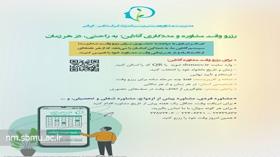 با سیستم "رزرو وقت شماورخ و مددکاری آنلاین: به راحتی، در هرزمان" دیگر نیازی به مراجعه حضوری برای رزرو وقت ندارید! سیستم آنلاین به شما این امکان را می دهد که از هر نقطه ای از دانشگاه و در هر زمانی وقت مشاوره خود را تعیین کنید. جهت کسب اطلاعات بیشتر به پوستر ضمیمه مراجعه نمایید.