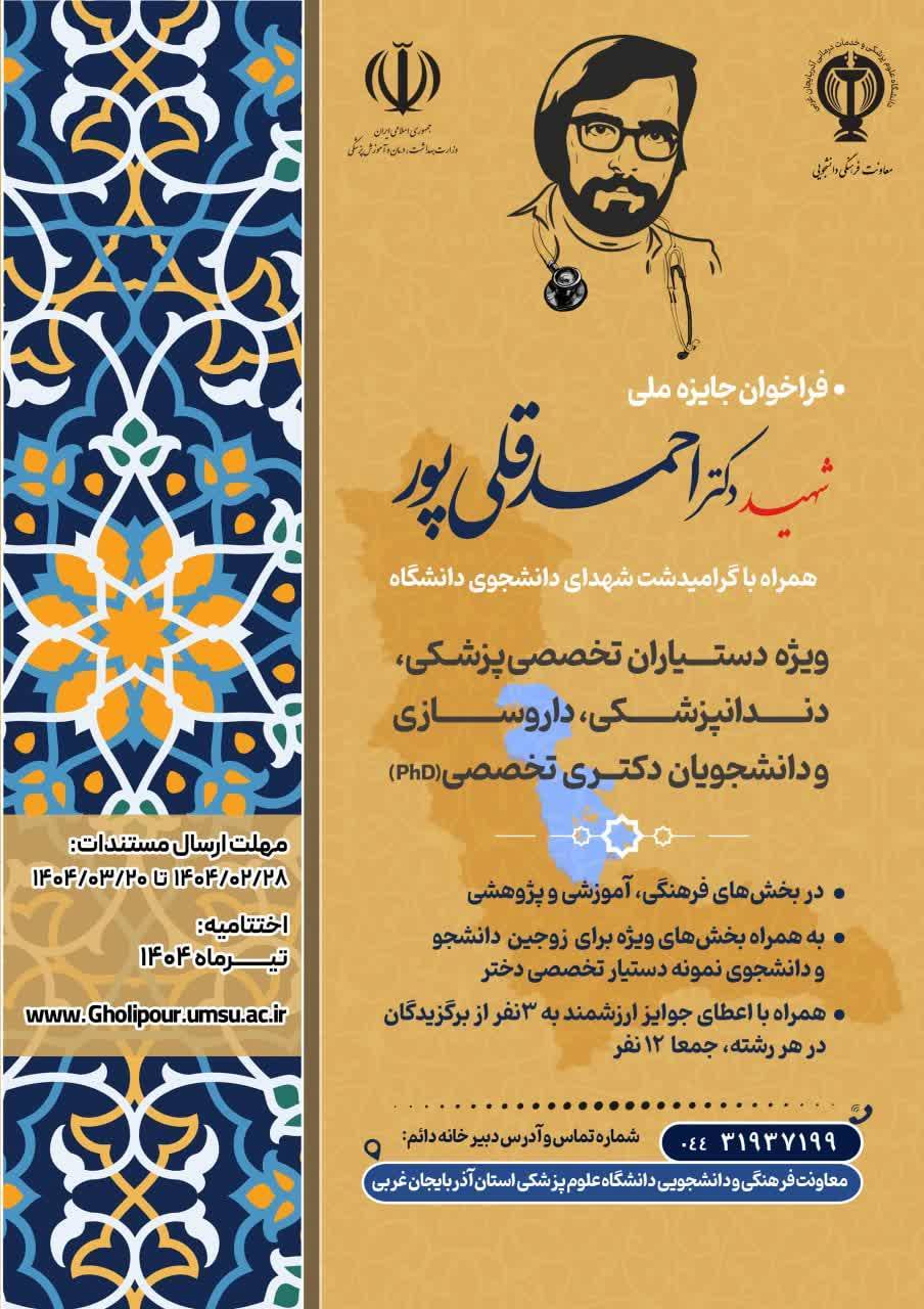 ویژه دستیاران تخصصی پزشکی، دندانپزشکی، داروسازی و دانشجویان دکتری تخصصی (PhD)در بخش های فرهنگی، آموزشی و پژوهشیدانشجویان می توانند با مراجعه به دانشگاه علوم پزشکی ارومیه به نشانی www.umsu.ac.ir اقدام به ثبت نام نمایند. فرم ارزشیابی و امتیازدهی جایزه ملی شهید قلی پور به پیوست می باشد.