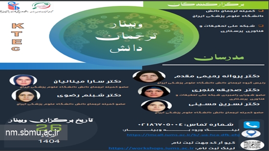 وبینار ترجمان دانش با همکاری شبکه ملی تحقیقات و فن آوری پرستاری و کمیته ترجمان دانش دانشگاه علوم پزشکی ایران در تاریخ 26 خرداد 1404 برگزار می گردد. جهت ثبت نام و کسب اطلاعات بیشتر به پوستر مراجعه نمایید.