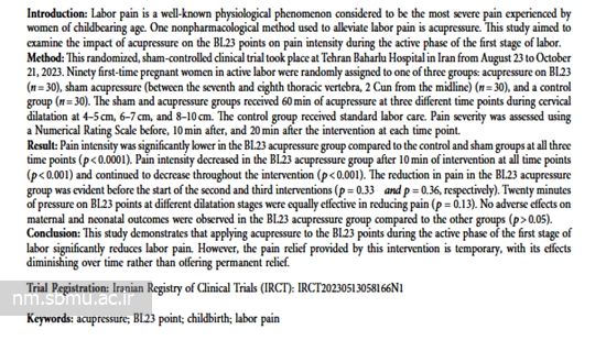 پادکست طرح پژوهشی با عنوان :Research Article Effect of BL23 Acupressure on Pain Among Primiparous Women During the First Stage of Labor: A Randomized, Sham-Controlled Trial