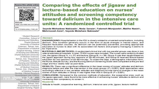 پادکست طرح پژوهشی با عنوان:Comparing the effects of jigsaw and lecture‑based education on nurses’ attitudes and screening competency toward delirium in the intensive care units: A randomized controlled trial