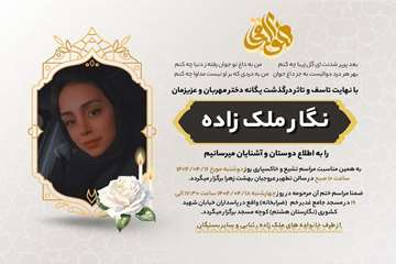 در گذشت دانشجوی عزیزمان سرکار خانم نگار ملک زاده دانشجوی کارشناسی رشته هوشبری موجب تالم و تاثر فراوان دانشگاهیان دانشکده پرستاری و مامایی به ویژه همکلاسی ها و استادان آن فقیده سعیده گردید.
