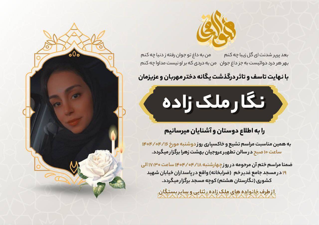به اطلاع می رساند مراسم ختم آن مرحومه روز چهارشنبه از ساعت 17:30 تا 19 در مسجد ضرابخانه واقع در محله پاسداران برگزار خواهد شد.