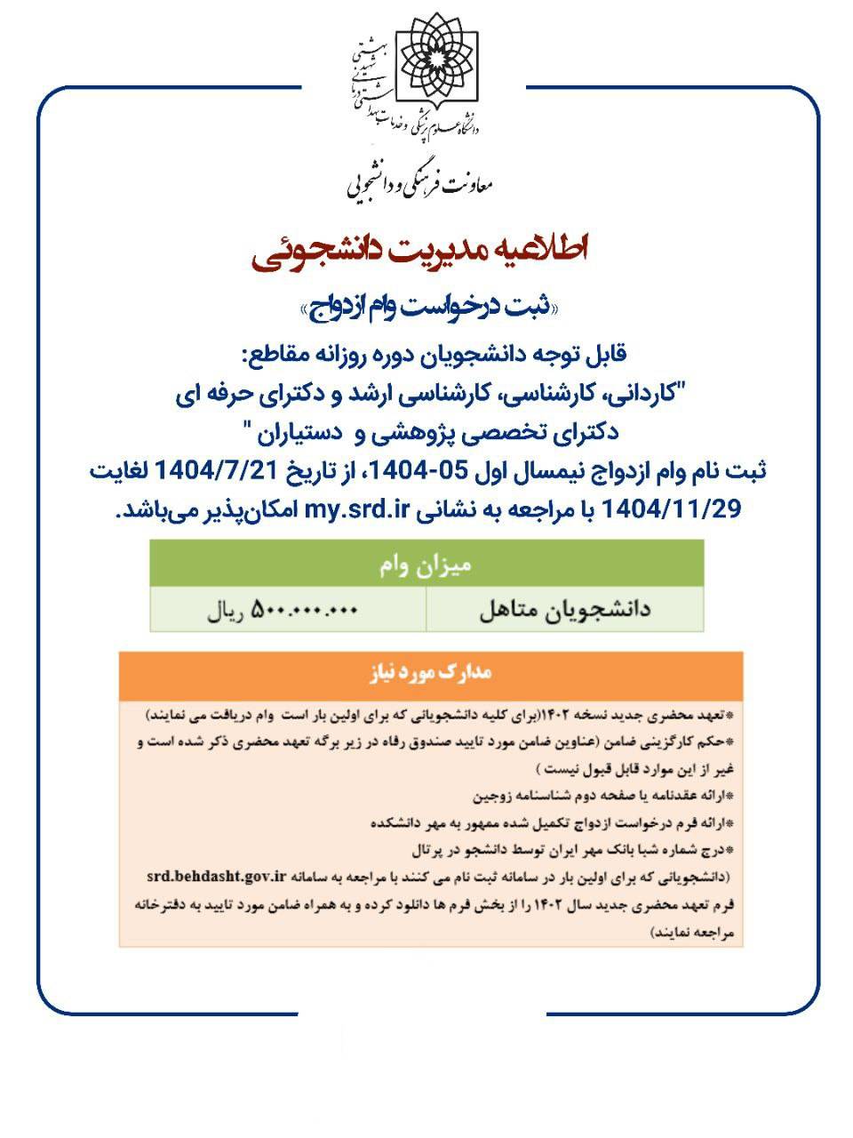 وام ازدواج سال ۱۴۰۴ به دانشجویانی تعلق میگیرد که تاریخ عقد آنها از ۱ مهر ۱۴۰۳ به بعد بوده و در زمان تحصیل باشند.